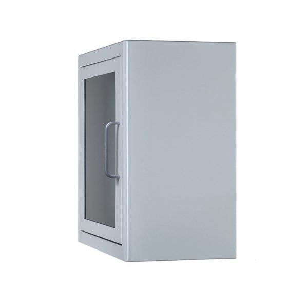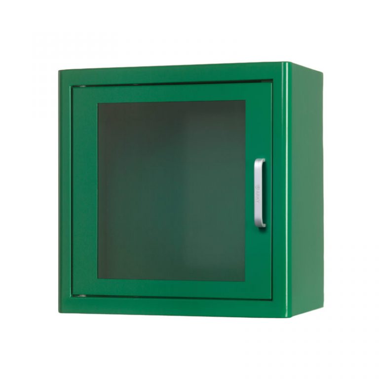 Zelena notranja omarica za AED (avtomatski eksterni defibrilator) z zvočnim alarmom, primerna za vse znamke AED-jev. Izdelana iz lahkega in trpežnega aluminija. Alarm se sproži takoj, ko se vrata omarice odprejo.
